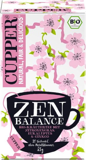 Zeliščni čaj z limonsko travo, evkaliptusom in ginkom. »Zen Balance«. Iz ekološke pridelave. 4 × 20 filter vrečk. V podjetju CUPPER iz Dorseta že od leta 1984 v pripravljajo čarobne čaje in poparke z intenzivnimi, drznimi in slastnimi okusi. Pri CUPPERju se vse vrti okrog okusa, saj verjamejo, da je vsaka skodelica čaja, vsaka mešanica ali čajna vrečka posebna in čarobna … z eno besedo: edinstvena. Leta 2018 je CUPPER postal prvo čajno podjetje na svetu, ki je prešlo na nebeljene čajne vrečke brez plastike in gensko spremenjenih sestavin, da bi zagotovilo ekološke čajne mešanice brez umetnih sestavin za povsem naraven napitek.