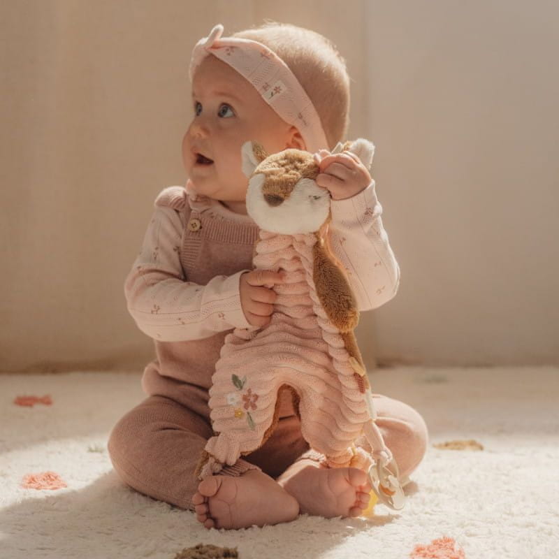 Mehak, ljubek jelenček Little Dutch iz zbirke Pravljični vrt. Ta čudoviti jelenček je popoln za crkljanje med igro ali spanjem. Igrača za crkljanje je izdelana iz mehkega, prijetnega črtastega materiala z ljubko vezenino, ima vozle, ki jih je enostavno prijeti, ter zanko za pritrditev dude. Različni izrastki/oznake stimulirajo dojenčkove čute z dotikom. Popoln kot prvo darilo za dojenčka. Vaš dojenček ga ima lahko vedno s seboj v posteljici ali vozičku. Starostna kategorija: 0m+ Dimenzije: 23 × 8 × 31 cm Sestava materiala: 100% poliester