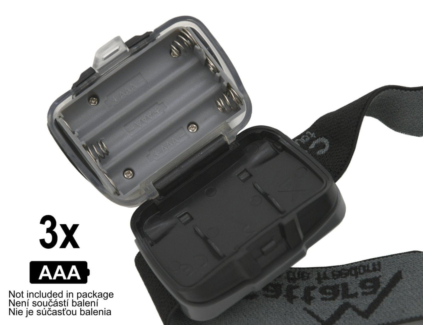 Izbirate lahko med več funkcijami, ki jih omogoča svetilka. Izbirate lahko med normalno in zatemnjeno svetlobo. Čelna svetilka deluje s tremi baterijami AAA z življenjsko dobo 4 ure.