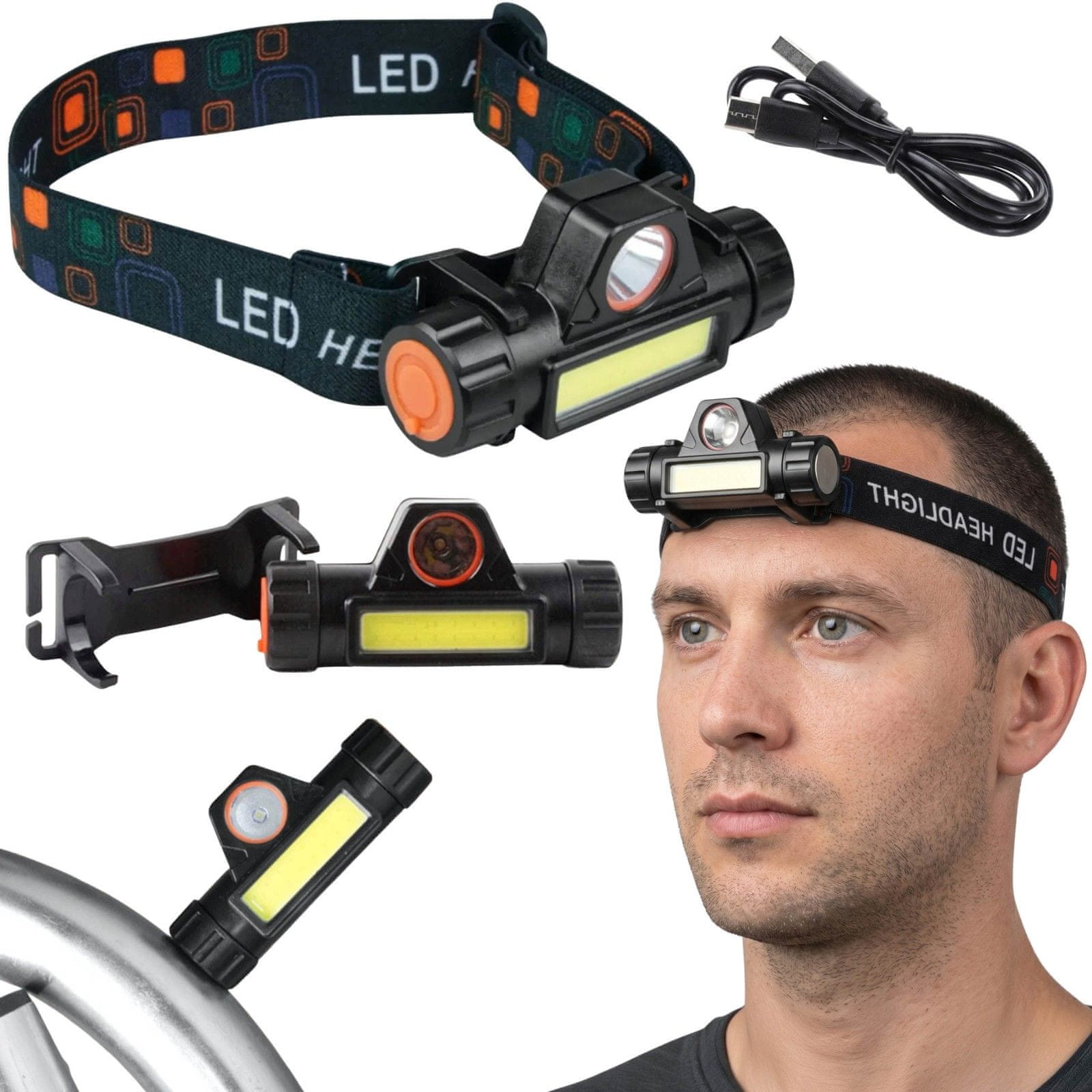 GARDEN LINE Močna dvofunkcijska LED-čelna svetilka, vojaška čelna svetilka, akumulatorska USB