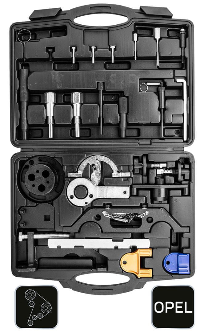 Komplet orodij za nastavitev krmiljenja Opel NEO Diesel je komplet orodij za blokiranje zobnikov krmiljenja v vozilih Opel. Komplet vsebuje komponente za blokiranje krmiljenja dizelskih motorjev. Zagotavlja osnovno orodje za nastavitev in blokiranje motorja. Komplet je pakiran v prenosni torbi.