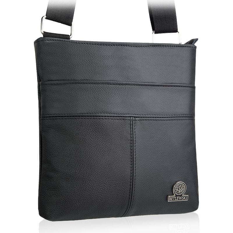 Usnjena torba za čez ramo znamke Betlewski®. ZAKAJ IZBRATI TORBO ZNAMKE BETLEWSKI®? Kupujete izdelek, izdelan na Poljskem. Izdelana iz pravega govejega usnja. Edinstven dizajn. Primerna za list A5. NA PRVI POGLED. Indeks: BTG-07. Material: pravo usnje. Znamka: BETLEWSKI®. Širina: 24 cm. Višina: 27 cm. Globina: 4 cm. Dolžina traku: 150 cm. Dodatne informacije: POLJSKI IZDELEK. IZDELEK ZNAMKE. Ta klasična, modna torbica BETLEWSKI® je izdelana na Poljskem iz visokokakovostnega pravega usnja. Njeno pristnost potrjujejo edinstvene podrobnosti, kot so kartonske in blagajne etikete ter črno-srebrn kovinski logotip znamke. Na torbo je pritrjen vzorec uporabljenega usnja. Edinstven kroj torbe in popolna embalaža zagotavljata, da bo to uspešno in edinstveno darilo! SKRITI ŽEP: Na sprednji strani torbe je velik, skriti žep z magnetno sponko. Idealen je za shranjevanje pametnega telefona. PROSTORNA NOTRANJOST: Torba se na vrhu zapira z močno zadrgo. V notranjosti je en manjši žep z zadrgo in en odprt žep, npr. za telefon. TORBA Z RAMENSKIM TRAKOM: Torba ima dolg, nastavljiv trak (največ 150 cm) za nošenje čez ramo. Izdelek ima robustne kovinske elemente, kot so zadrge in srebrni ročaji. POTRDILO O PRISTNOSTI: Izdelku je priloženo tudi potrdilo, ki potrjuje materiale in izdelavo torbe.
