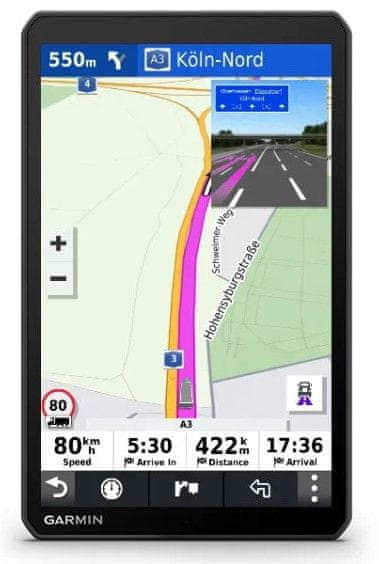 - Omogoča brezžično (Bluetooth) povezavo s telefonom in dostop do prometnih informacij, vremenskih napovedi in trenutnih cen goriva v živo (prenesti morate aplikacijo Garmin Drive)