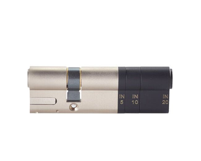 Nastavljiv cilinder, združljiv s pametno ključavnico Linus, 6-pinski rezani cilinder v varnostnem razredu 6 1-B-C5A, priložena 2 ključa. Celoten opis