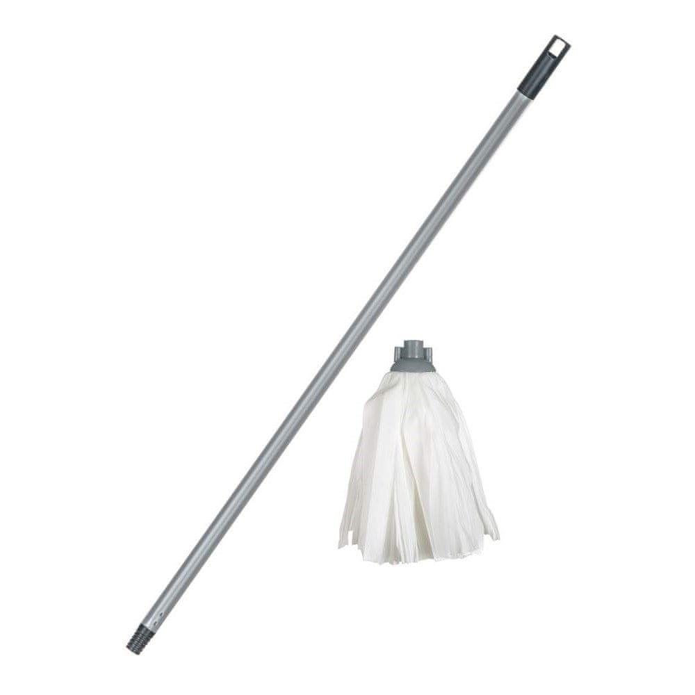 Okolju prijazen mop 110 g/m2 s 120 cm palico, groba nit, bela/srebrna barva plastike, primeren za mokro čiščenje tal.