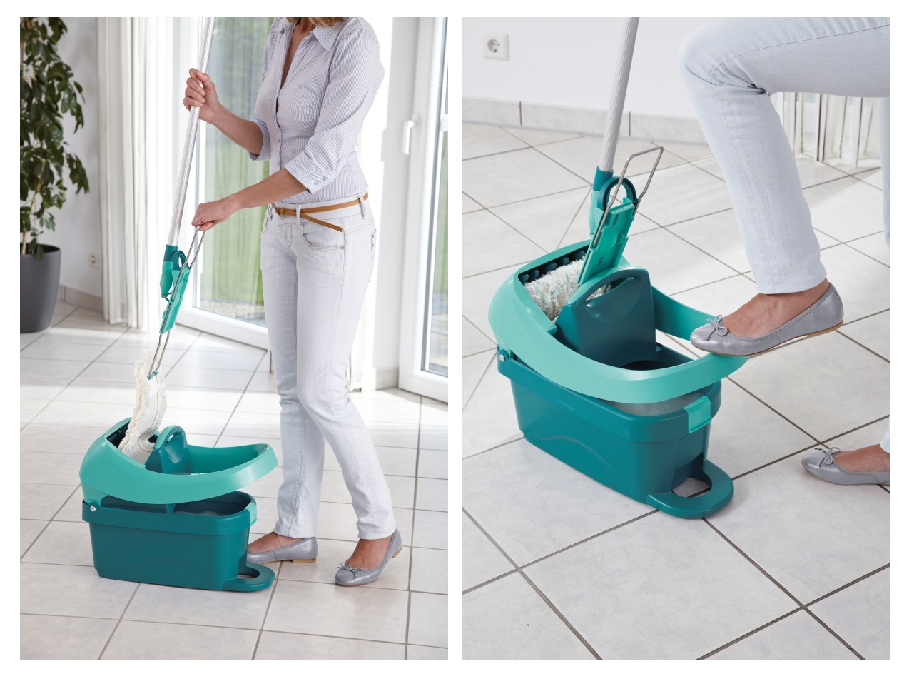 Leifheit Profi mop Nič več namakanja rok v umazano vodo. Komplet vedra za mop in ožemalnik Leifheit Profi micro duo s kolesi, ki je sestavljen iz profesionalnega vedra s priloženim ožemalnikom in profesionalnega mikro mopa, omogoča čiščenje s suhimi rokami in brez sklanjanja. Tako preprosto: z nogo odstranite blazinico iz držala in jo vstavite v ožemalnik. Nato jo ožemite z nogo in brez uporabe sile je končano. Krpa je suha, kot bi jo oželi na roko. Tla se bodo posušila v trenutku. Priložena krpa Profi micro duo s 3-delnim jeklenim ročajem temeljito očisti vsa tla. Zahvaljujoč tanki krpi z dvojnimi vlakni doseže najmanjše razpoke in temeljito odstrani tudi trdovratno umazanijo. Velika širina krpe za brisanje – 42 cm – vam prihrani veliko korakov in dragocenega časa. Genialni 360° vrtljiv zglob omogoča učinkovito čiščenje v cikcakastih vzorcih in okoli nog mize in omarice. Vedro za stiskanje krp ima zdaj dve enostavno vrtljivi kolesi, ki se nahajata neposredno na dnu vedra.