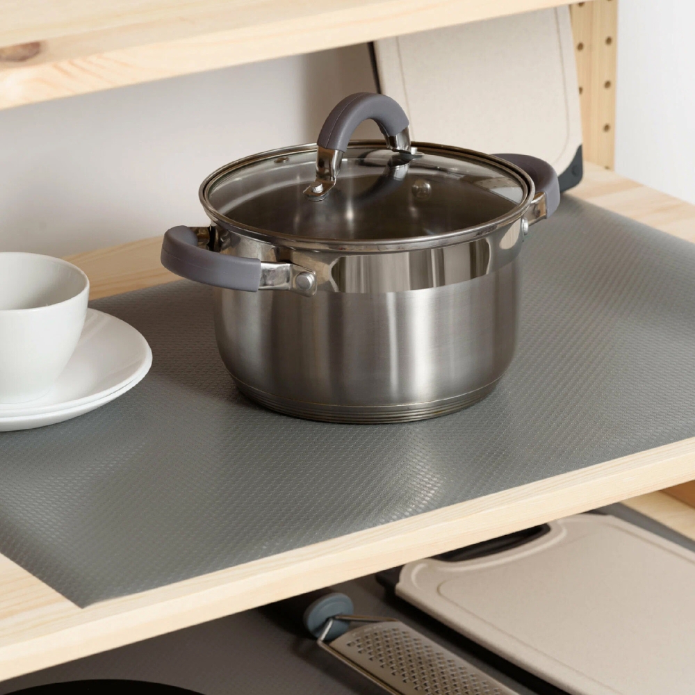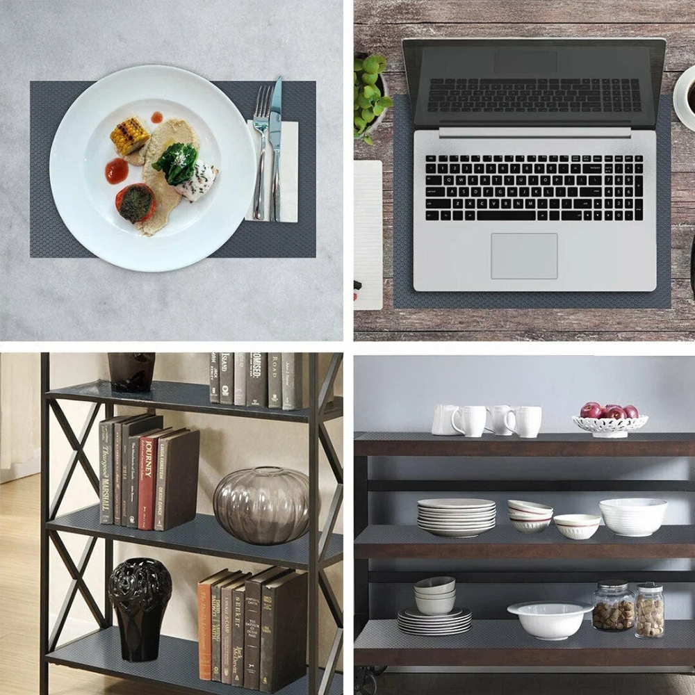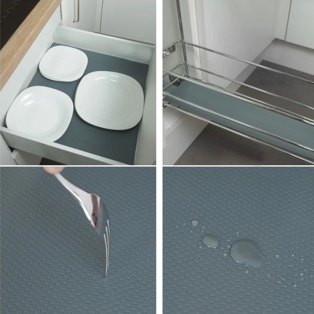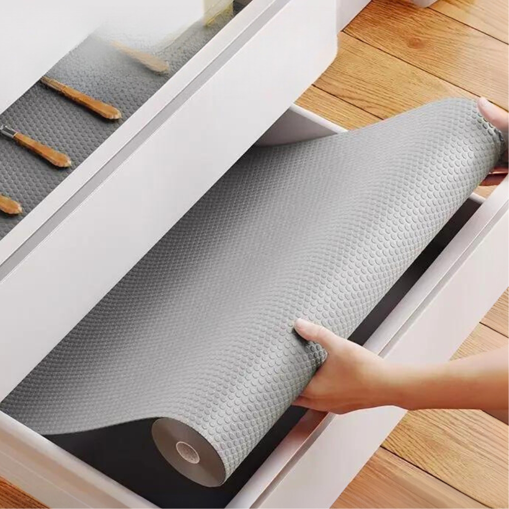 Zahvaljujoč posebni nedrseči strukturi podloga preprečuje drsenje predmetov , kar zagotavlja, da krožniki, kozarci in kozmetika ostanejo na svojem mestu. Je idealna rešitev za predale, omare, hladilnik ali celo police za čevlje!