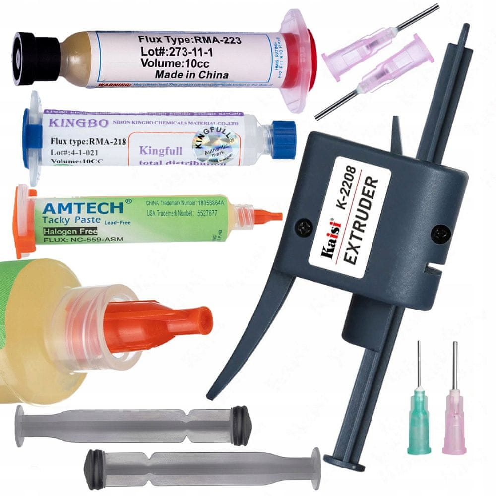 Komplet Rosfix je popolna rešitev za vsakogar, ki spajka in popravlja elektroniko. Pištola za fluks K-2208 z dvema iglama zagotavlja natančnost in nadzor, medtem ko trije različni fluksi – RMA-223, Kingbo 218 in NC-559-ASM – ponujajo vsestranskost in kakovost, ki ju potrebujete za različne projekte. Ne glede na to, ali delate na zapletenih tiskanih vezjih ali spajkate majhne komponente, ta komplet ponuja najkakovostnejša orodja in materiale, ki ustrezajo vašim potrebam.