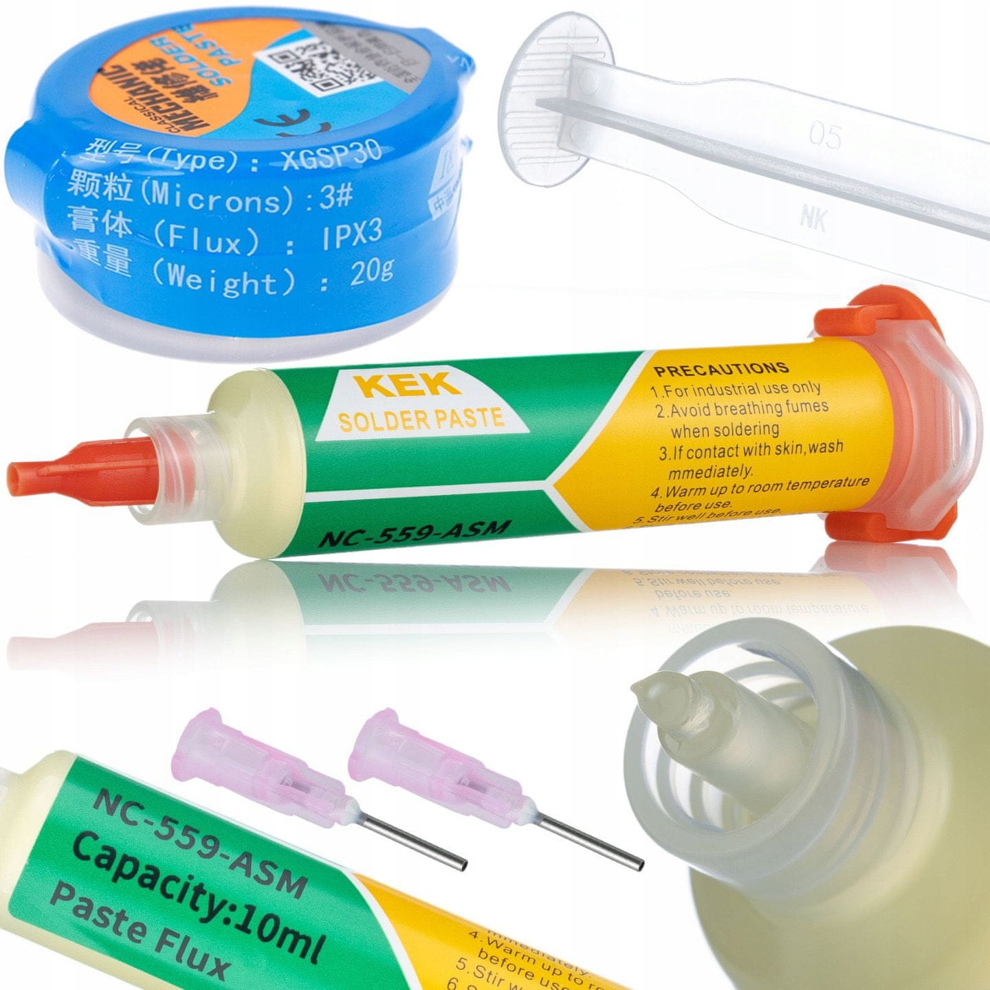 - Enostavnost uporabe: Zahvaljujoč brizgi s talilom in tubi spajkalne paste je komplet zelo enostaven za uporabo tudi za tiste, ki nimajo izkušenj s spajkanjem.