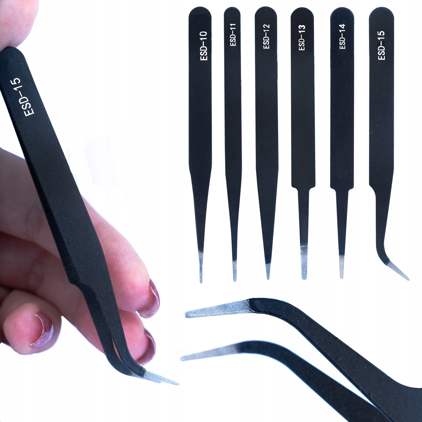 6 natančnih pincet:Ta set vsebuje 6 različnih pincet, zaradi česar je vsestransko orodje za natančno manipulacijo različnih komponent.