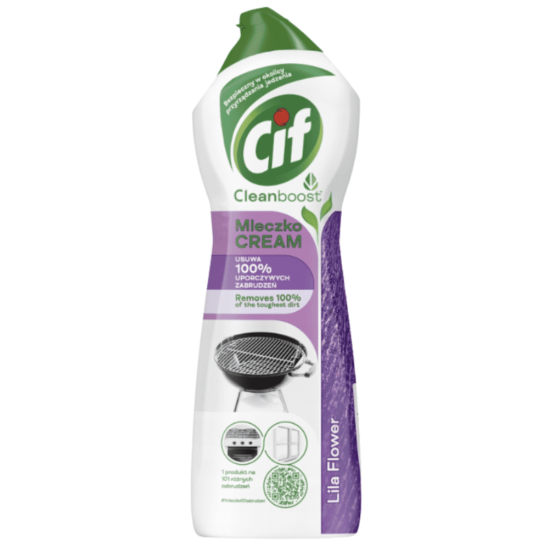 Cif Lila Flower čistilno mleko 780 gje izjemno učinkovito sredstvo za vsakodnevno čiščenje doma, ki združujemoč mikrokristalovz nežnostjo na površinah. Mlečna formula prodre globoko v madeže in učinkovito odstrani tudi najbolj trdovratno maščobo v kuhinji in vodni kamen v kopalnici, ki puščajo površinebleščeče čista .