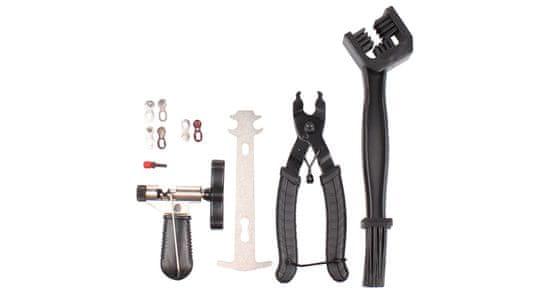 Komplet orodja Chain Set 7 podjetja Merco je namenjen osnovnemu servisiranju in zamenjavi kolesarskih verig. Paket vsebuje 7 osnovnih orodij. Za enostavno zamenjavo in odklop verige so priložene klešče za hitro sprostitev z gumiranimi ročaji. Hitre spojke so na voljo v treh različicah: 9S, 10S in >. Če na verigi še nimate hitrega sprožilca, boste za odklop verige zagotovo potrebovali kovičar. Pri povezovanju verige zaradi skrajšanja ali zamenjave priporočamo uporabo hitrih členkov ali povsem novih zakovic. Kako prepoznam, da je veriga močno obrabljena? Z osnovnim merilnikom. Ko se merilo prilega verigi, je čas za skrajšanje verige ali nakup nove. Za vožnje z bolj zahtevnimi podnebnimi razmerami je v kompletu tudi univerzalna krtača, s katero lahko prodrete na težko dostopna mesta. Vsebina paketa: klešče za hitro odpiranje, zakovica, klešče za hitro odpiranje, osnovno merilo, krtača.