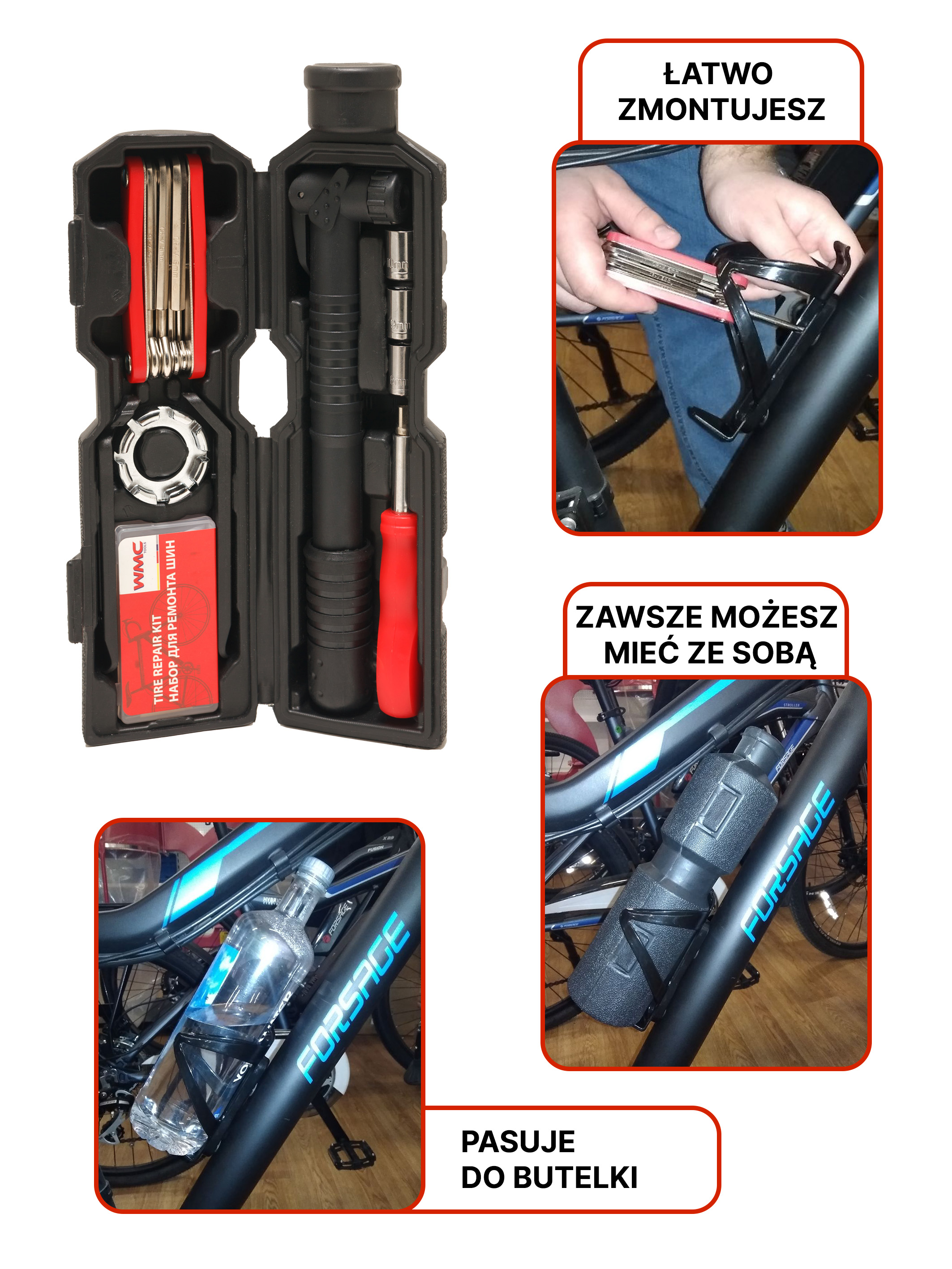 Praktičen komplet osnovnega kolesarskega orodja v embalaži v obliki plastenke.