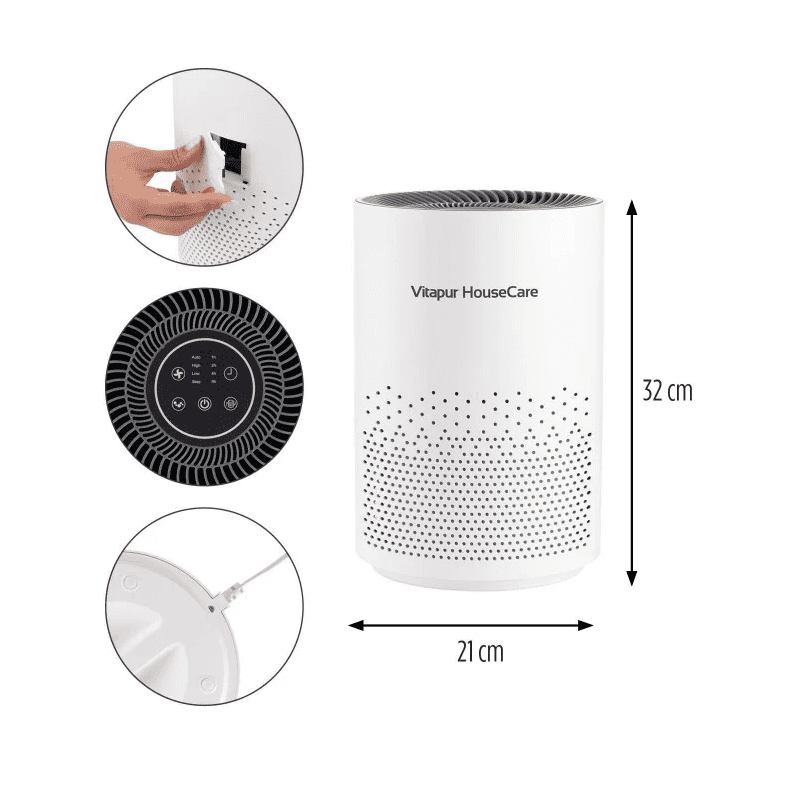 Čistilnik zraka Vitapur HouseCare AirClean je vrhunska rešitev za boljšo kakovost zraka v vseh prostorih tvojega doma. S kombinacijo izjemnega filtra HEPA H11 in predfiltra z ogljikovim premazom iz zraka pomaga odstraniti tudi najmanjše prašne delce, viruse, alergene in druge onesnaževalce. Še posebej bo navdušil vse, ki trpijo zaradi alergij, astme in drugih respiratornih težav. Moderen in kompakten čistilnik zraka se ponaša tudi s povsem enostavnim upravljanjem na dotik, ki omogoča popoln nadzor nad delovanjem.