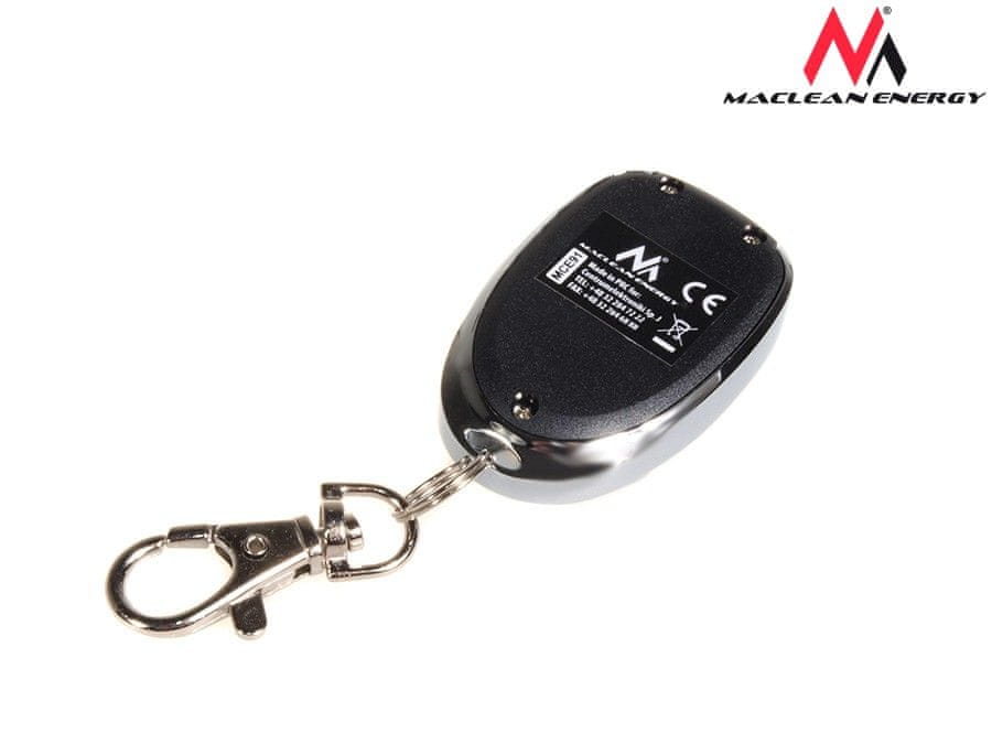 Visokokakovostni popolnoma nov daljinski upravljalnik Maclean. Naprava je namenjena ljudem, ki imajo originalni daljinski upravljalnik in bi radi dobili rezervnega. Ima elegantno, robustno ohišje s kromiranimi vložki in drsnim zaklopom. Daljinski upravljalnik kopira signal večine daljinskih upravljalnikov (za vrata, krmilnike, alarme, avtomobile) s plavajočo kodo 433,92 Mhz.