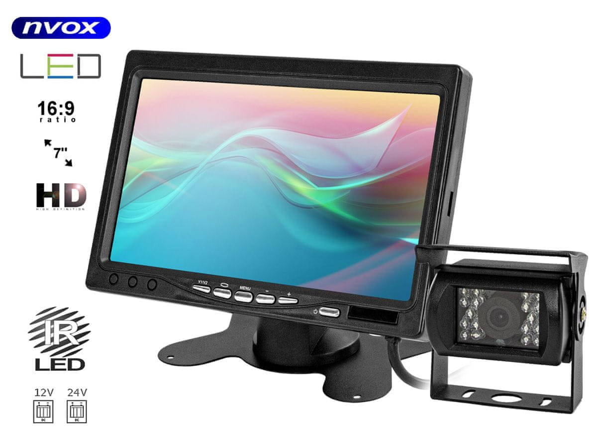• podpira do 2 kameri- pomožne linije za parkiranje- napajanje 12/24V- delovna temperatura: –30 do 80 stopinj- Monitor:- široki format HD digitalnega LCD 16:9 Active Matrix System- 7-palčna matrika HD LCD proizvajalca SHARP- svetlost 500:1– kontrast 500:1– ločljivost H