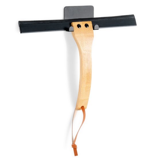 Solidna izdelava – Otiralnik je izdelan iz kakovostne črne kovine, z ročajem iz bambusa. Otiralnik ima gumijasto rezilo, kavelj pa je iz črne kovine.