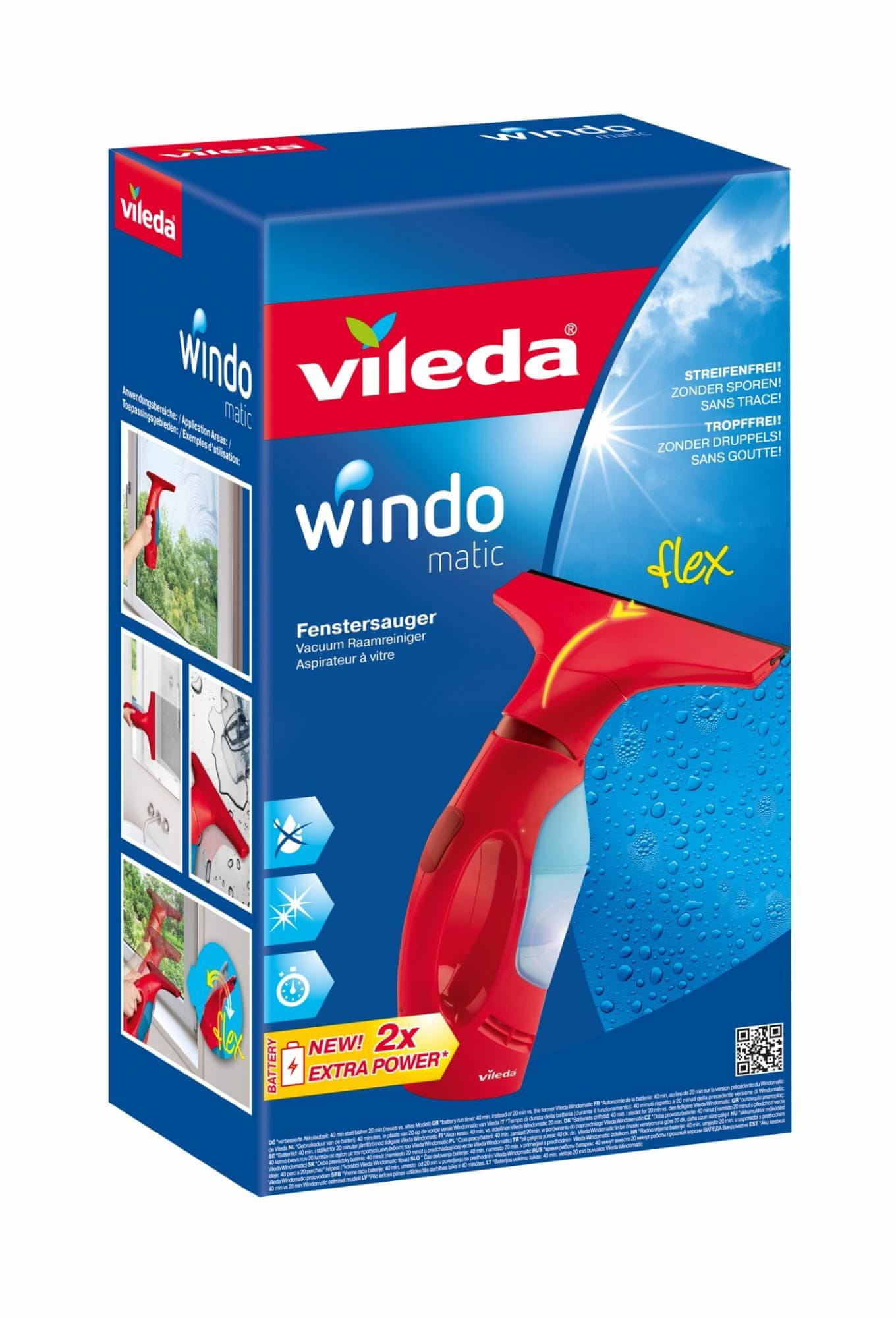 Vileda WindomaticVileda predstavlja inovativni vakuumski čistilnik oken Windomatic, ki vam omogoča enostavno uporabo. Uporabite vakuumski čistilnik Windomatic, katerega rezultat so čista okna brez sledi in umazanije. Windomatic se s svojim gumijastim robom prilega na okno in učinkovito posesa vso umazano vodo, ki steče v integrirani vodni rezervoar. Gumijasti rob Windomatica je 2 x preložen in odstrani vse kaplje vode ter umazanijo. Primeren je za vse gladke površine, kot so steklene površine, ploščice, mize in podobno. Fleksibilna glava Windomatica omogoča čiščenje na robovih in vogalih. Litij-ionska baterija omogoča delovanje do 40 minut oziroma čiščenje površine 60 m2. Ergonomsko oblikovan ročaj prinaša udobje. |