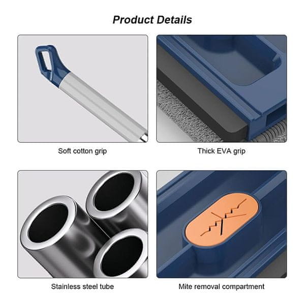 Material: PP + nerjaveče jeklo + bombažna vlakna Barva: modra Velikost ročaja: 133 cm Velikost plošče za mop: 42 × 12 cm