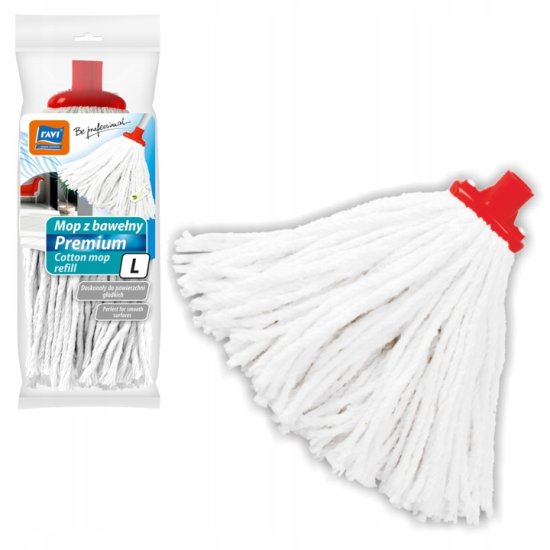 Ekonomičen, enostaven za uporabo in vzdržljiv mop iz bombaža. Zelo dobro vpija vodo, odstranjuje močno umazanijo brez puščanja lis. Čiščenje je enostavno in prijetno. V primeru močne umazanije ga lahko perete v pralnem stroju pri 40 °C. Plastični navojni konec omogoča enostavno namestitev na kateri koli ročaj.