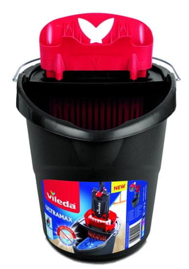 Vedro z ožemalnikom za enostavno in optimalno ožemanje Ultramax ploščatega čistilca. Izboljšani ožemalnik omogoča enostavno in udobno ožemanje prevleke – do želene vlažnosti prevleke. Roke ostanejo čiste in suhe.
