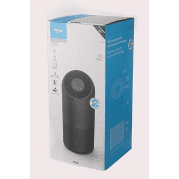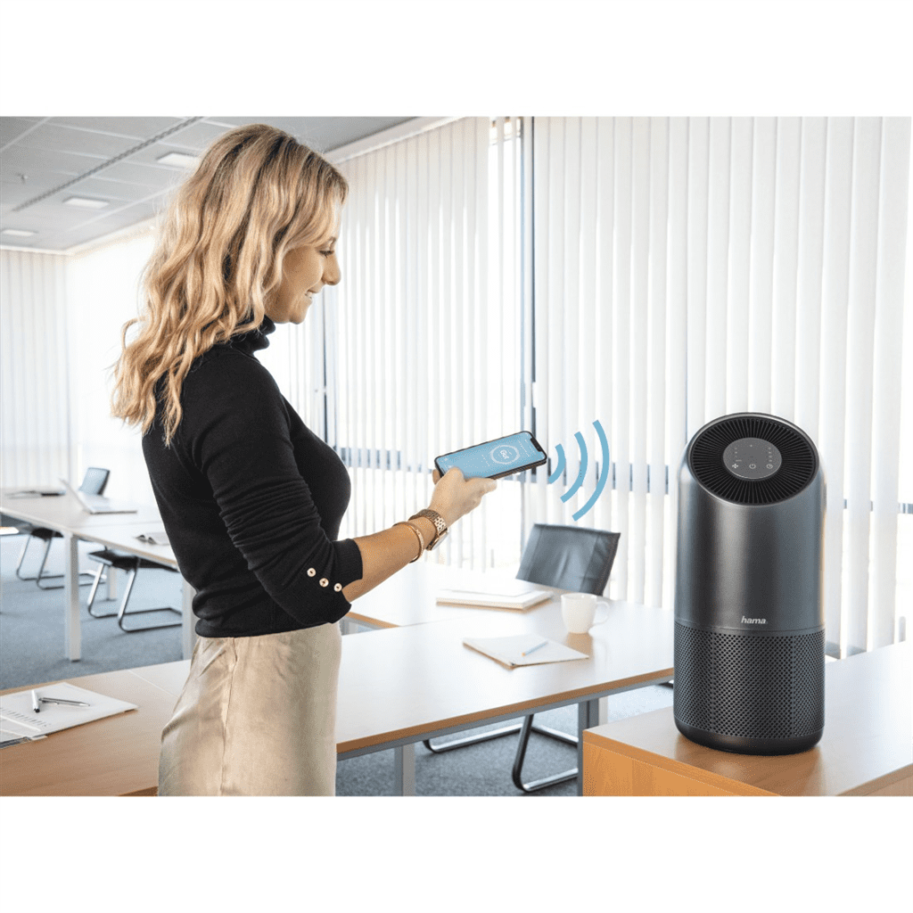 - čistilec zraka z možnostjo upravljanja prek aplikacije Hama Smart Home, z glasom prek Alexe ali Googla ali ročno prek plošče na dotik