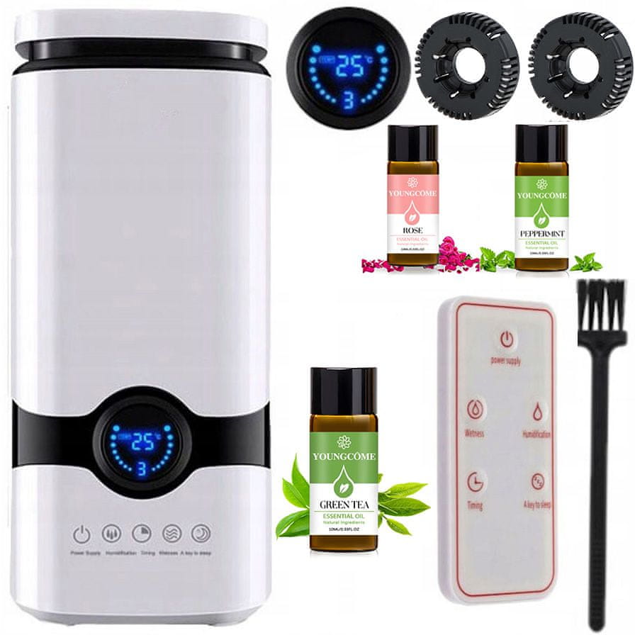 Aromaterapevtski vlažilec zraka White Fresh + set 3 olj + 2 rezervna filtra Funkcija samodejnega vzdrževanja vlažnosti, ki zagotavlja optimalne zračne razmere v prostoru. Set vsebuje 2 filtra. Velik 4-litrski rezervoar, ki zagotavlja do 48 ur delovanja z enim polnjenjem. Zelo tih, pod 30 db, in učinkovit – ustvari 300 ml/h vlaženja zraka. Popoln za prostore do 100 m2, zato ga lahko uporabljate doma, v pisarni ali dnevni sobi. Vključuje higrometer in termometer, ki omogočata spremljanje trenutne vlažnosti in temperature v prostoru. Ima funkcijo aromaterapije, zahvaljujoč kateri lahko vodi dodate kapljice olj in uživate v prijetnem vonju. Ima funkcijo ionizacije zraka, ki nevtralizira neprijetne vonjave in izboljša kakovost zraka. Opremljen z velikim, jasnim LCD zaslonom in funkcijo SLEEP, ki zatemni osvetlitev ozadja, da ne moti vašega spanca. Priročno upravljanje prek plošče na dotik ali daljinskega upravljalnika ter funkcija časovnika, ki omogoča samodejni izklop po določenem številu ur. Možnost nastavitve količine izpihane meglice, kot tudi samodejni izklop naprave, ko zmanjka vode. Eleganten dizajn in skrbna izdelava iz najkakovostnejših materialov, ki zagotavlja vzdržljivost in dolgotrajno uporabo. Vsakemu vlažilniku so priložena 3 dišavna olja v vrednosti 19,99 PLN vsako, kar je dodatno brezplačno darilo. Odlična naprava: Profesionalna naprava, idealna za domačo uporabo ali uporabo v kozmetičnih salonih. Zelo visoka moč Sprostitveni trenutki, samo za vas Idealno za nespečnost, težave povezane s stresom Pomaga pri zdravljenju depresije Podpira prebavo telesa Ohranja optimalno zračno vlago, kar zmanjšuje tveganje za bolezni in alergije Vpliva na sprostitev celega telesa, hrbta, stopal, vratu, vratu, teleta, rok, želodca, celega telesa Zmanjšuje zbiranje prahu Čisti zrak Pomaga pri bolečinah menstruacija pri ženskah Lahko se uporablja tudi z eteričnimi olji, ki pomagajo pri sprostitvi in uživanju v trenutku sprostitve Set je kot nalašč za darilo Prednosti aromaterapije: Lajša stres Sprosti, sprosti napete mišice po napornem dnevu Odpravlja nevralgijo Lajša razdražljivost. V hladnih večerih deluje ogrevalno. Stimulira imunski sistem. Izboljša cirkulacijo. Lajša bolečine. Deluje baktericidno in protivnetno. 1️⃣0️⃣ Odlično sprosti telo po telesni vadbi. Nosna sluznica se izsuši, kar pomeni, da ne ščiti ustrezno pred okužbami. Vlažilec zraka skrbi za vzdrževanje ustrezne vlažnosti zraka in spodbuja vlaženje nosne sluznice. Še več, prostor očisti bakterij in umazanije ter je odličen tudi za sprostitev! Uporablja se lahko kjerkoli! Doma, v avtu, na pikniku, v pisarni ali kozmetičnem salonu. Delovalo bo v vsaki situaciji. Tehnične specifikacije vlažilnika: Prostornina rezervoarja: 4 litre Učinkovitost: do 300 ml/h Moč: 28W LCD zaslon Časovnik (1–8h) Nočni način Daljinski upravljalnik 360-stopinjsko vrtljiva parna šoba Konfiguracija vlažnosti v območju od 40 do 80 RH% v intervalih 5 RH% Funkcija aromaterapije Keramični filter za vodo in ogleni filter za zrak Navodila v poljščini Mere: Višina: 38 cm Širina v najširšem delu: 17 cm Lajša: Menstrualne bolečine Bolečine v hrbtu, išias Sprošča, pomirja Sprošča mišice Izboljšuje prebavo Pozitiven učinek pri zdravljenju nespečnosti, depresije in posttravmatskega stresa Eterična olja imajo antibakterijski, razkuževalni, protivnetni in celo protivirusni učinki v različnih stopnjah. Pravilna uporaba aromaterapevtskih olj spodbuja imunski sistem telesa, povečuje odpornost proti okužbam, izboljša prekrvavitev in deluje protibolečinsko. Ta aromaterapevtski vlažilec zraka je kot nalašč za vsakogar, ki skrbi za udobno in zdravo notranje okolje. Še posebej je priporočljiv za ljudi, ki imajo težave z dihali, kot so astma ali alergije, saj pomaga vzdrževati primerno raven vlage v zraku. Prav tako je dobra izbira za ljudi, ki želijo izboljšati kakovost zraka v svojem domu ali pisarni. Komplet vsebuje: beli vlažilec zraka z napajalnim kablom daljinski upravljalnik 2 filtra krtačo originalno embalažo 3 olja (poslana naključno – ni možnosti izbire vonja) vlažilec je priročen in enostaven za uporabo zahvaljujoč številnim praktičnim rešitvam. Pokrov na vrhu rezervoarja omogoča enostavno točenje vode, ne da bi morali odstraniti celoten rezervoar, poleg tega pa olajša čiščenje notranjosti. Vlažilnik ima 360-stopinjsko vrtljivo šobo, ki omogoča poljubno prilagajanje smeri izhajajoče pare. To je idealna rešitev za ljudi, ki se želijo izogniti poplavi pohištva ali zmanjšati vlažnost v določenem kotu prostora. Vzdrževanje vlažnosti Vlažilnik ima več uporabnih funkcij. Zahvaljujoč funkciji samodejnega vlaženja lahko nastavite stopnjo vlažnosti v prostoru in vlažilec bo to vrednost vzdrževal sam. Ta funkcija poskrbi, da se vlažilnik samodejno vklopi, ko vlažnost pade pod nastavljeno vrednost, in se izklopi, ko jo doseže. Daljinski upravljalnik Upravljanje vlažilnika je zelo preprosto zahvaljujoč priloženemu daljinskemu upravljalniku. Zahvaljujoč temu lahko priročno spremenite nastavitve vlažilnika od kjer koli v prostoru. Funkcija spanja Funkcija spanja vam omogoča, da izklopite zaslon vlažilnika in ga zatemnite, da vas ponoči ne moti med spanjem. Časovnik Časovnik je še ena funkcija, ki vam omogoča nastavitev časa delovanja vlažilnika. Nastavite lahko čas od 1 do 8 ur, po katerem se vlažilnik samodejno izklopi. Na primer, ko nastavimo vrednost na „6“, bo vlažilec deloval 6 ur in se nato samodejno izklopil. Vgrajen termometer in higrometer Vlažilnik je opremljen z vgrajenima termometrom in higrometrom, ki prikazujeta podatke o temperaturi in vlažnosti v prostoru. Te informacije se izmenično prikazujejo, kar vam omogoča spremljanje pogojev v prostoru. Za enostavno uporabo je v kompletu priložen daljinski upravljalnik. To vam omogoča, da vlažilnik zraka upravljate z večje razdalje, ne 
