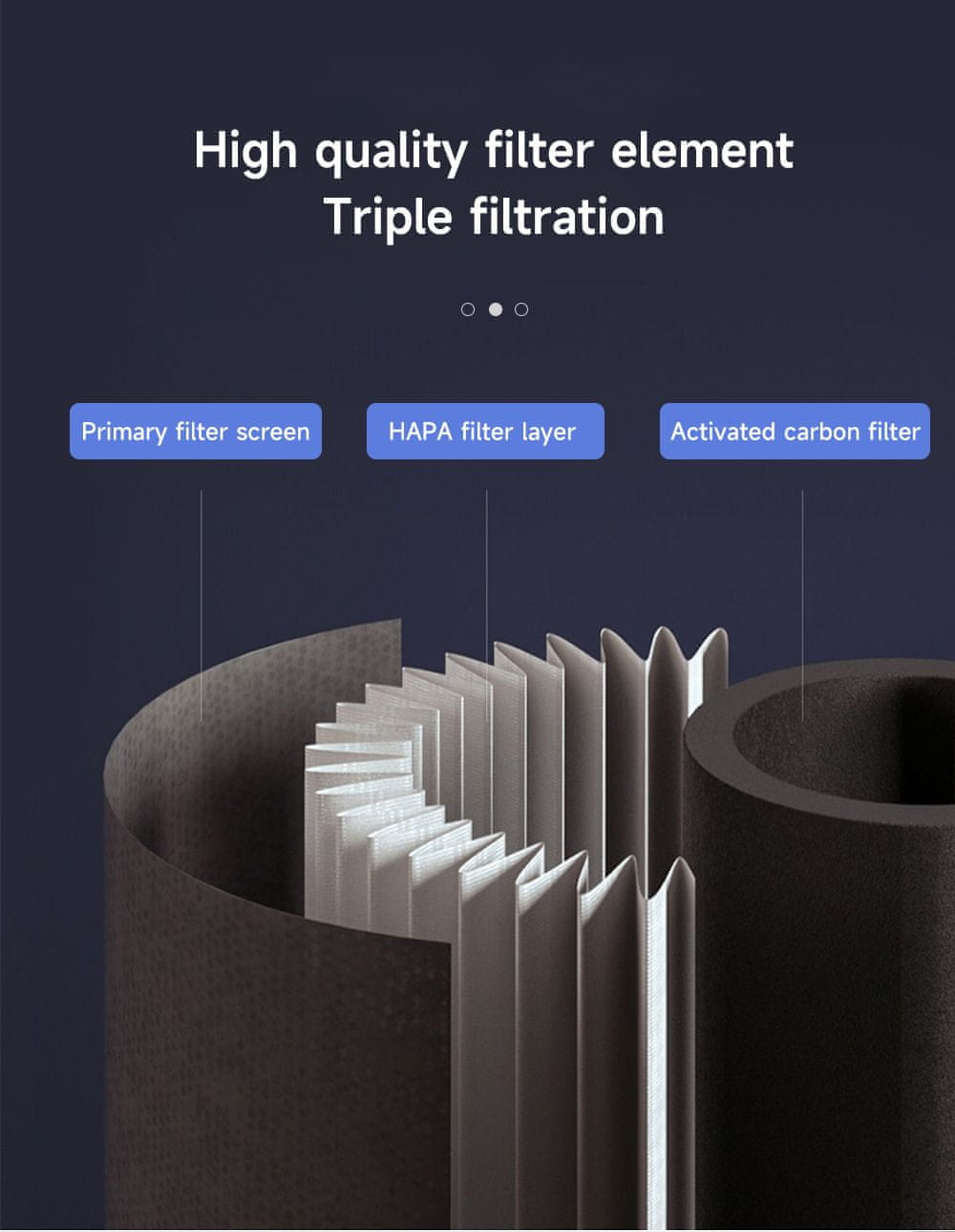 • Trislojni kompozitni HEPA H12 filter z aktivnim ogljem in negativnimi ioni učinkovito odstrani 99,7 % delcev v zraku, vključno s PM2,5, vonjavami in HOS.