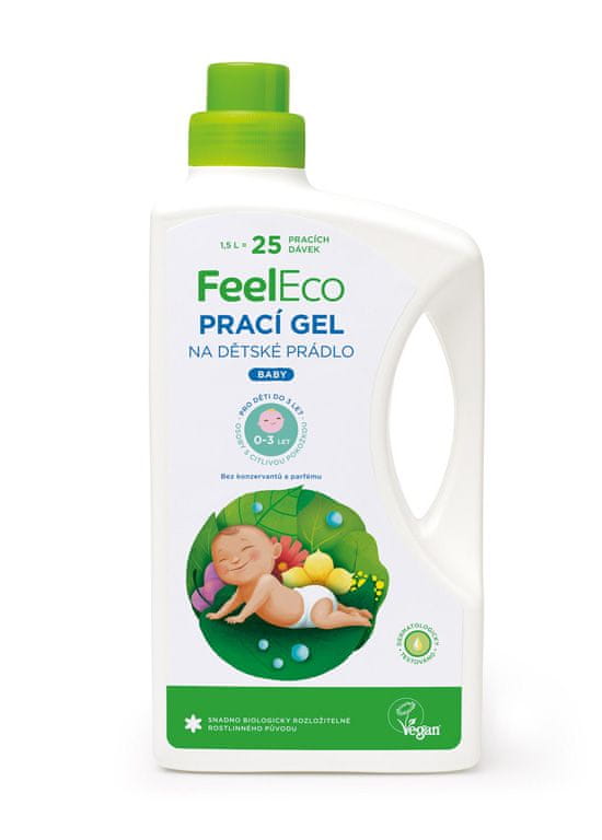 Feel eko pralni gel BABY je primeren za belo, barvno in temno perilo. Zahvaljujoč svoji sestavi in mešanici encimov je zelo učinkovit tudi pri nizkih temperaturah pranja, komponente za zaščito barve pa poskrbijo, da bo perilo tudi po večkratnem pranju izgledalo enako.