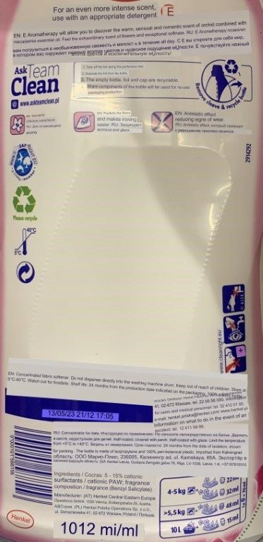 Učinkovit mehčalec 1,1 l. Mehčalec z vonjem vrtnice je profesionalni mehčalec, ki ščiti vlakna pred poškodbami z zmanjšanjem statične elektrike. Njegova posebna formula zagotavlja tkaninam izjemno mehkobo in puhastost. Izdelek je zelo učinkovit. Prednosti in uporaba: Mehčalci dajejo tkaninam čudovit, dolgotrajen vonj in mehkobo. Cenili boste tudi njihove negovalne lastnosti. Z redno uporabo mehčalca naravno podaljšate življenjsko dobo svojih oblačil. Zmanjša trenje med pranjem in zgladi vlakna. Vaša oblačila po pranju ne bodo izgubila oblike, se ne bodo raztegnila, predvsem pa bo njihov videz ostal privlačen zelo dolgo časa. Varen je za kožo. Primeren za pranje oblačil, spodnjega perila, posteljnine, brisač, zaves in različnih drugih tekstilij. Parametri: Blagovna znamka: E Učinkovitost: 50 pranj Uporaba: Mehčalec Prostornina: 1,1 l Vonj: Vrtnica Cena na kos