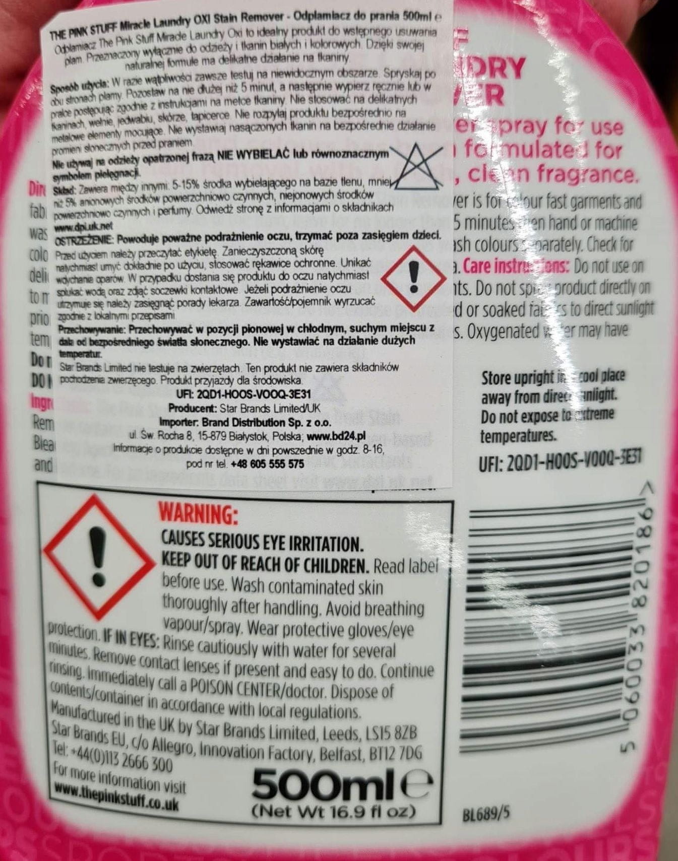 Odstranjevalec madežev v spreju Pink Stuff Star Drops je izdelek, ki učinkovito odstranjuje trdovratne madeže. Varen je za večino tkanin, tako barvnih kot belih. Priročen sprej omogoča natančen nanos. Specifikacije: Znamka: Stardrops Prostornina: 0,5 l Namen uporabe: odstranjevanje madežev