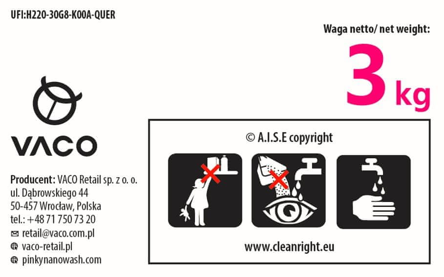 | Izjave o varnosti in nevarnosti AISE | Po uporabi si umijte roke., Hraniti izven dosega otrok., Izogibajte se stiku z očmi. V primeru stika z očmi, temeljito sperite z vodo. |