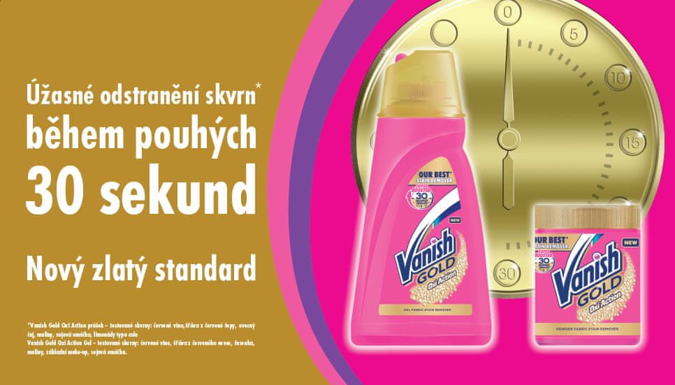 Vanish Oxi Action Gold tekoči detergent se lahko uporablja na belih in barvnih tkaninah. Namenjen je odstranjevanju trdovratnih madežev kot so vino, sadje ali ličila. Pri normalnem pranju se za odstranjevanje madežev doda v stroj 120ml praška. Za namakanje se v 4 litre tople vode doda1 20 ml detergenta in namaka do ene ure. Pri res trdovratnih madežih se detergent nanese neposredno na madež, pusti delovati 10 minut in nato opere kot običajno.