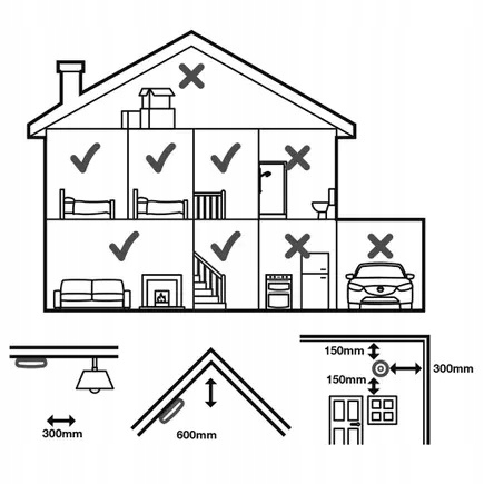 Da boste v primeru požara pravočasno opozorjeni, je priporočljivo namestiti vsaj en detektor dima v vsako nadstropje. Priporočljivo je namestiti detektor v vsak prostor, skozi katerega morate iti, da pobegnete, na primer v hodnik, podest ali stopnišče. Dim se dviga, zato je treba detektorje dima vedno namestiti na strop. Namestitev je enostavna in jo je mogoče izvesti z montažno ploščo ali nekaj vijaki. Senzor je mogoče namestiti tudi z magnetnim kompletom.