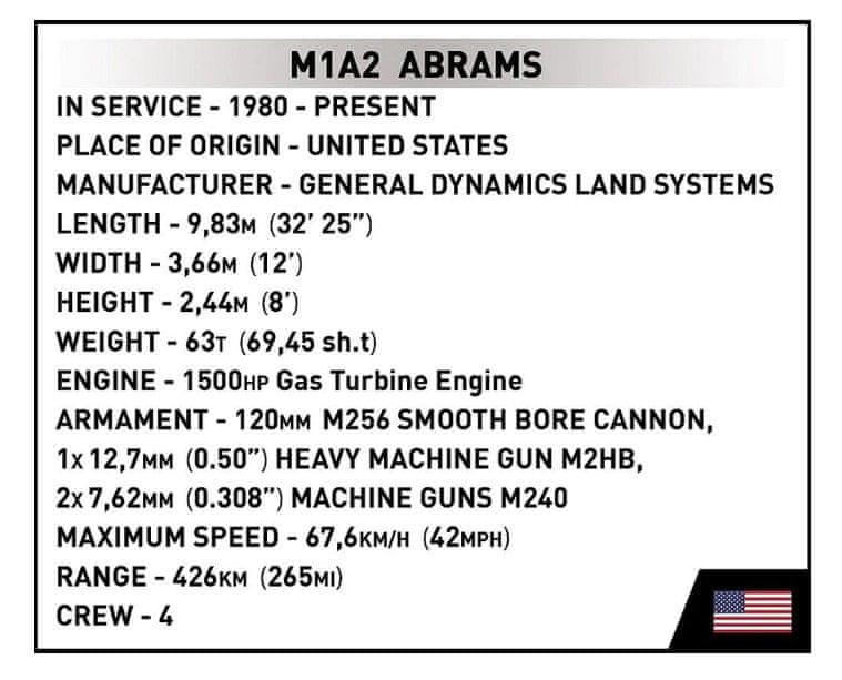Abrams je eden najboljših tankov sodobnega bojišča! Od leta 1980 ga proizvaja ameriško obrambno podjetje General Dynamics Land Systems. Tank se nenehno spreminja, da ustreza novim standardom, ki povečujejo njegovo bojno vrednost. Značilnost tanka je kupola, ki zavzame skoraj toliko prostora kot preostali del tanka. V svoji zasnovi se Abrams ponaša z večslojnim oklepom, ki zagotavlja visoko stopnjo zaščite pred HEAT naboji. Tanki Abrams so bili prvič uporabljeni v boju v zgodnjih devetdesetih letih med operacijo Puščavski vihar. Od takrat je bil Abrams vpleten v zaporedne vojaške spopade, v katere so bile vpletene Združene države. Ta komplet poustvari svoj videz v drugi zalivski vojni leta 2003.