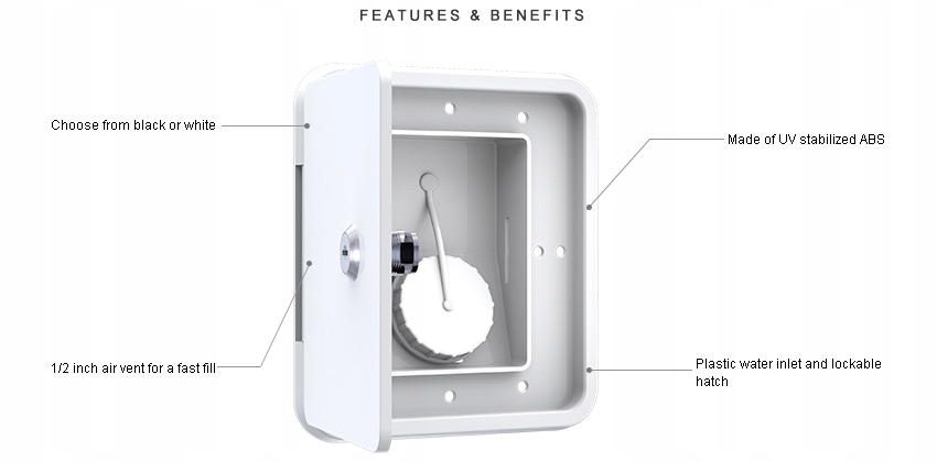 VTIČNICA ZA POLNJENJE VODE Z ZRAČNIKOM IN ZAKLEPANJEM Uporablja se v prikolicah, avtodomih in čolnih Izdelano iz visokokakovostne plastike (ABS), odporne na vremenske razmere.
