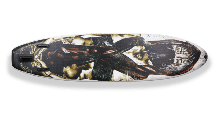 Mednarodno priznani ulični umetnik Eddie Colla je to potovalno desko za stand-up veslo z edinstveno in vznemirljivo grafiko, 10,6-palčnim krovom in veslom iz ogljikovih vlaken opremil s svojim imenom. Stil Eddieja Colle je neposreden in pritegne pozornost. S svojimi urbanimi odtenki in temnimi podtoni je pomemben element novega SUP-a, navdahnjenega z ulično umetnostjo. Ulična umetnost je svoboden prikaz umetnikove ustvarjalnosti brez omejitev muzejev in galerij. Takšna svoboda izražanja je primerljiva s tisto, ki jo človek doživi na krovu SUP-a med samostojnim potovanjem ali družinskim izletom. Glavna tehnologija, ki jo uporabljamo v naših napihljivih deskah SUP, je 2LF – Fusion Technology. Dve prekrivajoči se plasti visoko trdnega PVC laminata, ki sta prikazani v (E) in (F), sta toplotno povezani brez uporabe lepila. Termično varjenje tako zagotavlja, da so naše deske za stoječe supe do 25 % lažje od standardnih napihljivih desk. Z drugimi besedami,