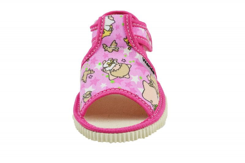 Zabavni otroški copati iz naravnega tekstilnega materiala sandalaste oblike z odprtim prstom. Podplat je izdelan iz mehkega, a trpežnega stiropora. Zapenjanje je z velcro. Copati se popolnoma prilagodijo obliki otrokovega stopala. Zagotavljajo udobno hojo in spodbujajo zdrav razvoj otrokovega stopala.