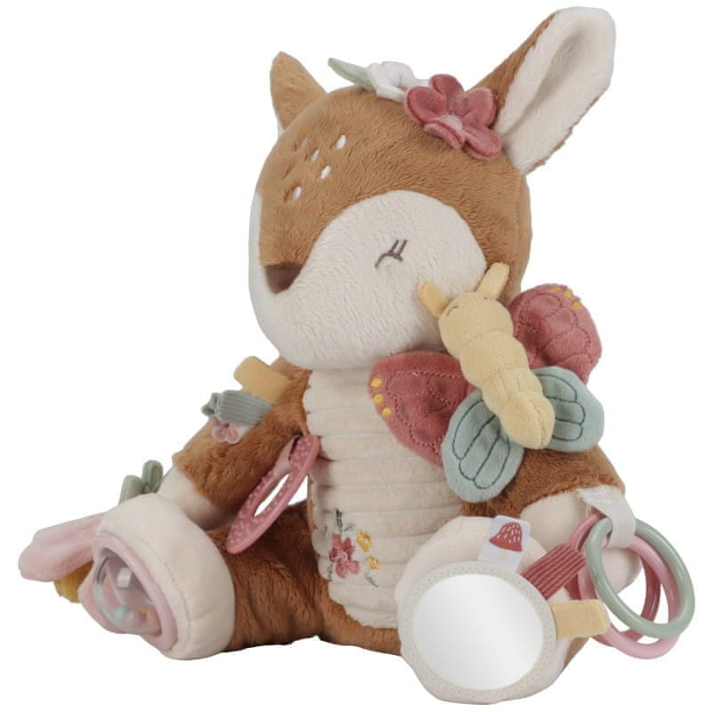 Aktivna ljubkovalna igrača Jelenček znamke Little Dutch iz zbirke Pravljični vrt. Ta čudovit jelen je več kot le ljubkovalna igrača – odkriti mora toliko zanimivosti. Šumeč metulj na rami, zvoki ropotulj, rože in etikete – ki jih obožujejo malčki, kolesa, ogledalo – toliko podrobnosti, ki bodo vzbudile radovednost vašega dojenčka. In ko je zabave konec, lahko Jelene crkljate in sanjarite na pravljičnem vrtu. Igrača, ki je zasnovana za pomoč pri vadbi otrokovih motoričnih sposobnosti med igro. Odlična, poučna zabava zagotovljena! Odlična ideja za darilo. Starostna kategorija: 0m+ Dimenzije: 25 × 22 × 27 cm Sestava materiala: 100% poliester