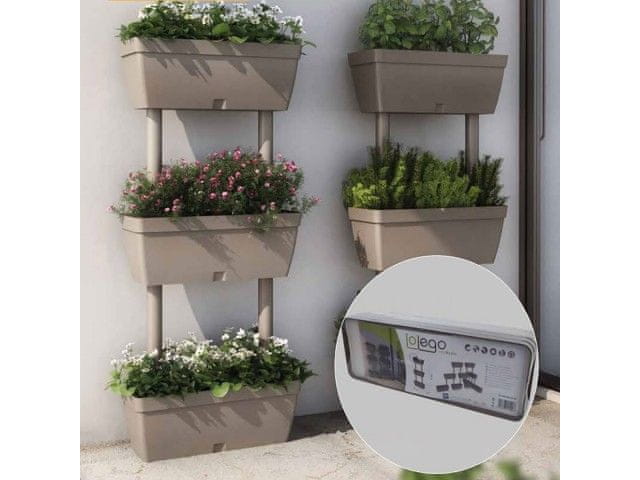 sistem LoLEGO, več zabojčkov je mogoče sestaviti v različne komplete, idealno za cvetlični ali zeliščni vrt na terasi ali balkonu, en komplet = 3× samooskrbni zabojček in 4× povezovalne cevi, izdelano v Italiji