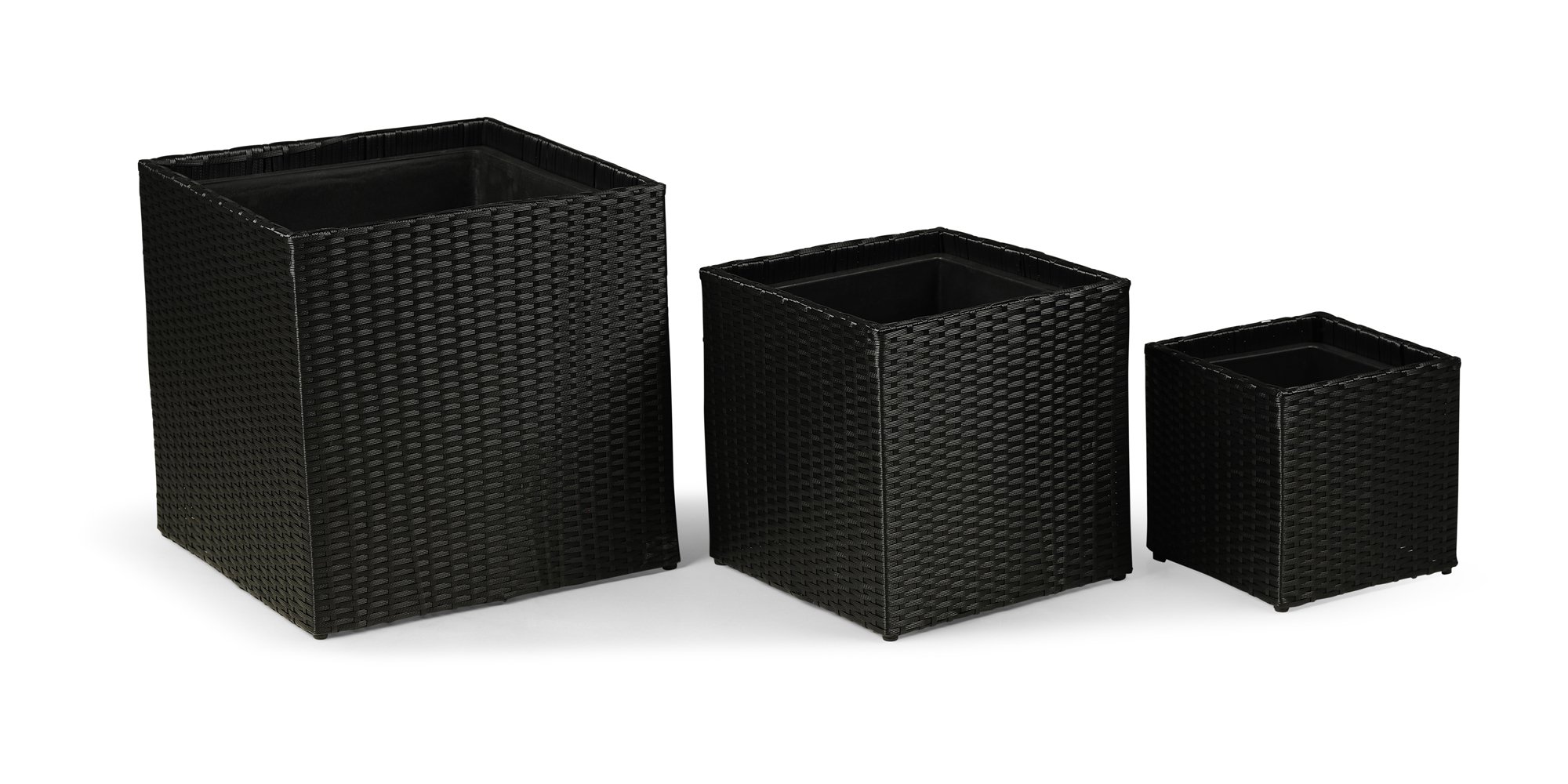 Komplet treh sadilnikov iz ratana s polipropilensko oblogo. Sadilniki so odporni na vremenske vplive in jih je enostavno čistiti. Primerno za uporabo v zaprtih prostorih in na prostem. Stabilna in trdna konstrukcija. Manj običajna kvadratna oblika posod bo zagotovo pritegnila pozornost. Privlačna črna zasnova, zaradi katere se prilegajo praktično povsod.