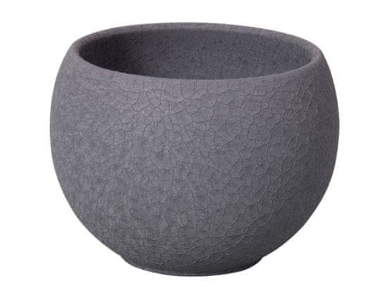 Keramični okrogli pokrov za cvetlične lončke v prašni barvi. Glazura je nanesena v večjem sloju, je matirana, rahlo izvlečena v nepravilnih oblikah. Barva: siva. Premer: 20 cm, višina: 15 cm.