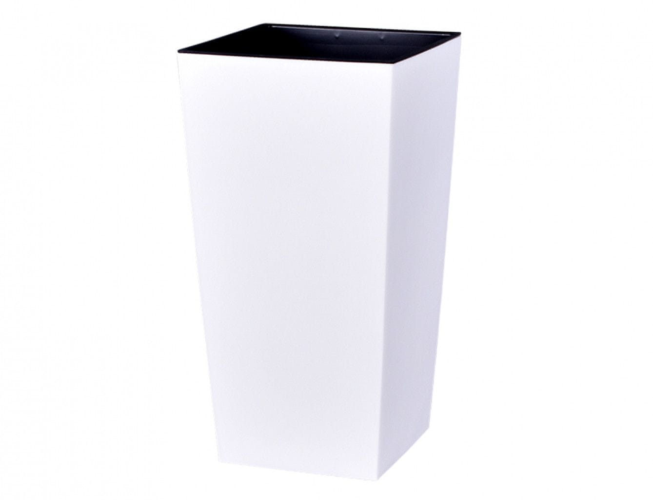 Visoka posoda iz matirane plastike kvadratnega tlorisa z gladko zasnovo, ki vključuje notranjo oblogo z udobnimi ročaji za lončke z rastlinami, primernimi za uporabo v zaprtih prostorih. Barva: bela. Širina: 27 cm, globina: 27 cm, višina: 50 cm.
