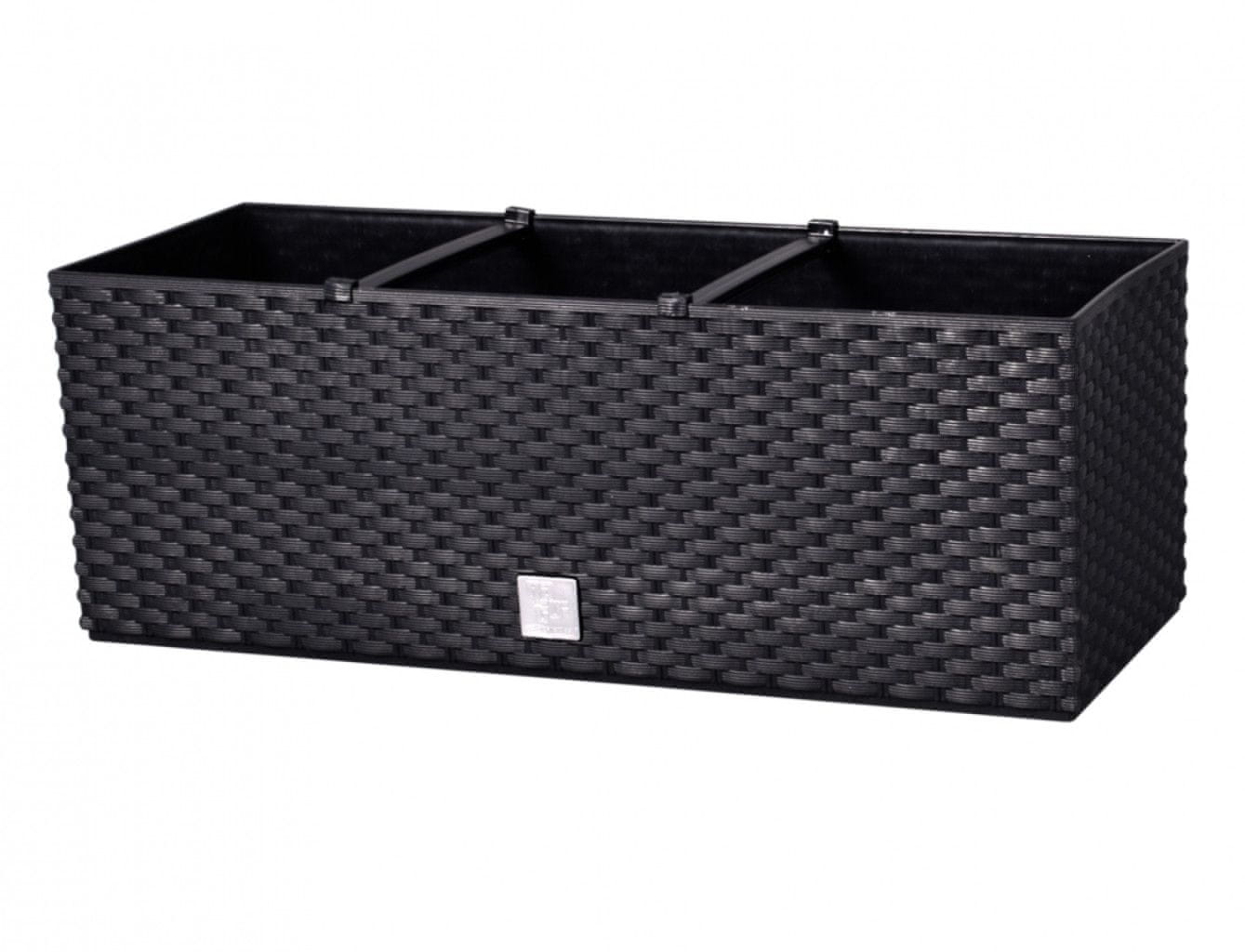 Plastični samooskrbni sadilnik s teksturo, ki posnema pletenje iz ratana. Ta skrinja je odličen dodatek k elegantni notranjosti. Primeren je za uporabo v zaprtih prostorih in na prostem ter je odporen na UV-žarke. Vključuje črno notranjo oblogo z 2 distančnikoma. Barva: antracitna. Širina: 51 cm, Celoten opis