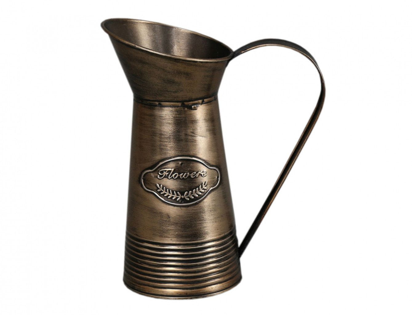 Kositrni vrč bakrene barve z okrasom v obliki črtic na spodnjem delu oboda in naslovom FLOWERS. Širina: 21 cm, višina: 23 cm, globina: 13 cm. Celoten opis