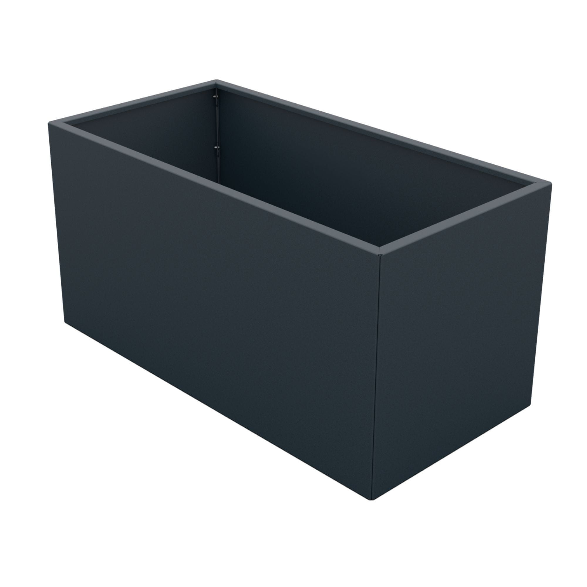 Cvetlično korito je izdelano iz visokokakovostne 1,5 mm debele pocinkane pločevine, kar zagotavlja odlično odpornost proti koroziji in dolgo življenjsko dobo. Površina je barvana z UV-odporno in vodoodporno barvo v odtenku RAL 7016 FS (antracitno siva), ki zagotavlja moderen in eleganten videz ter dodatno zaščito pred vremenskimi vplivi.