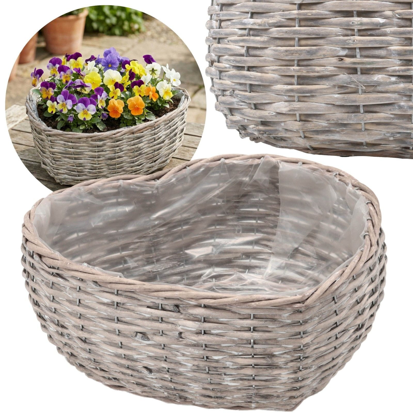 GARDEN LINE Velika, pletena prevleka s folijo v obliki srca, cvetlični lonec, pletena košara 32x34x13 cm