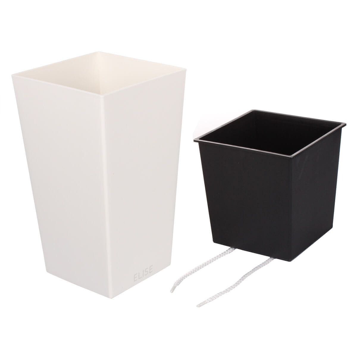 Eleganten dekorativni sadilnik Elise Mat z matiranim zaključkom je idealen dodatek za dom in vrt. Kvadratni sadilnik s snemljivo posodo je izdelan iz trde plastike, ki je odporna na mraz in ima UV-stabilizator, zato ga lahko brez skrbi pustite na vrtu pozimi in v sončnem poletju. Sadilnik ima vgrajen vijačni preliv za odvajanje deževnice. Elise Mat 15 ima vgrajen sistem za samooskrbo z vodo s kati. Modele Elise Mat 20 / 25 / 30 lahko kupite s sistemom za samooskrbo Elise Smart System. Sadilnik ima v vsakem vogalu kavlje za priročno odstranjevanje notranje posode. Elise Mat 15 Višina: 26 cm Dolžina zgornjega roba: 14,5 cm Višina prostora za sajenje: 15 cm Elise Mat 20 Višina: 36,5 cm Dolžina zgornjega roba: 19 cm Višina prostora za sajenje: 20 cm Elise Mat 25 Višina: 46,5 cm Dolžina zgornjega roba: 24 cm Višina prostora za sajenje: 25 cm Elise Mat 30 Višina: 57,5 cm Dolžina zgornjega roba: 28,5 cm Višina prostora za sajenje: 30 cm