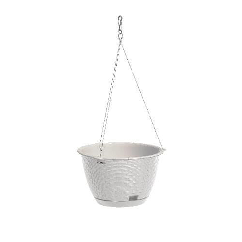 Plastični viseči sadilnik s priloženim krožnikom in plastičnim kavljem za obešanje. Barva: bela. Premer: 22 cm, višina: 14 cm.