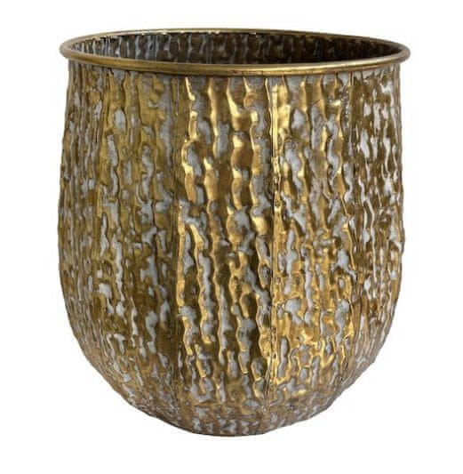 Kovinski pokrov za cvetlični lonec s strukturo orehove lupine v zlati barvi, premer 36 cm, višina 37 cm. Celoten opis